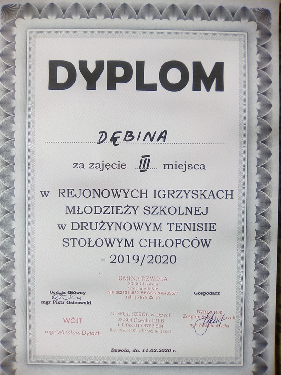 W dniu 4 i 11 lutego odbyły się zawody rejonowe w drużynowym tenisie stołowym chłopców, które zostały rozegrane w Dzwoli w powiecie janowskim. W kategorii Igrzysk Młodzieży Szkolnej nasz zespół w składzie Jonasz Zaleszczyński, Konrad Gołąb wywalczył trzecie miejsce.