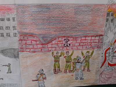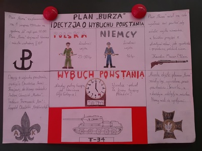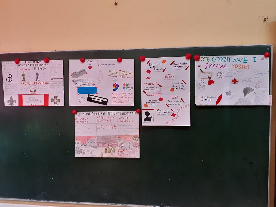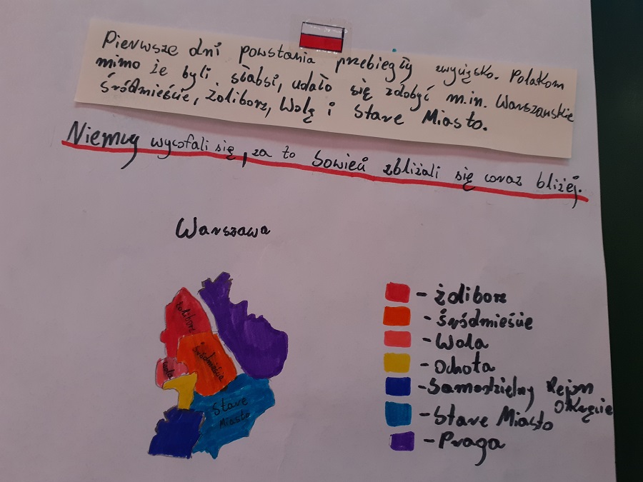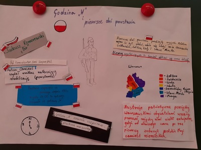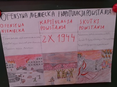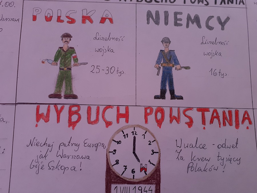 „Powstanie Warszawskie to symbol waleczności i męstwa nie tylko dla mieszkańców Warszawy, ale dla nas, Polaków. 77 lat temu nasi przodkowie stanęli do nierównej walki ze znienawidzonym wrogiem pragnąc wolności, wolnej Polski. To też jedno z najtragiczniejszych wydarzeń w polskiej historii. Dlaczego doszło do wybuchu powstania? Jak ono przebiegało? Co zrobili nasi sojusznicy? I jaką cenę zapłaciła Warszawa?” - te słowa padają na początku filmu przygotowanego przez Arkadiusza Patera. Po zapoznaniu się z nim ósmoklasiści podzieleni na 5 grup przygotowali infografikę na temat następujących zagadnień: