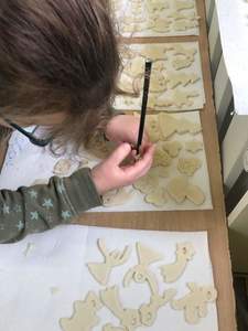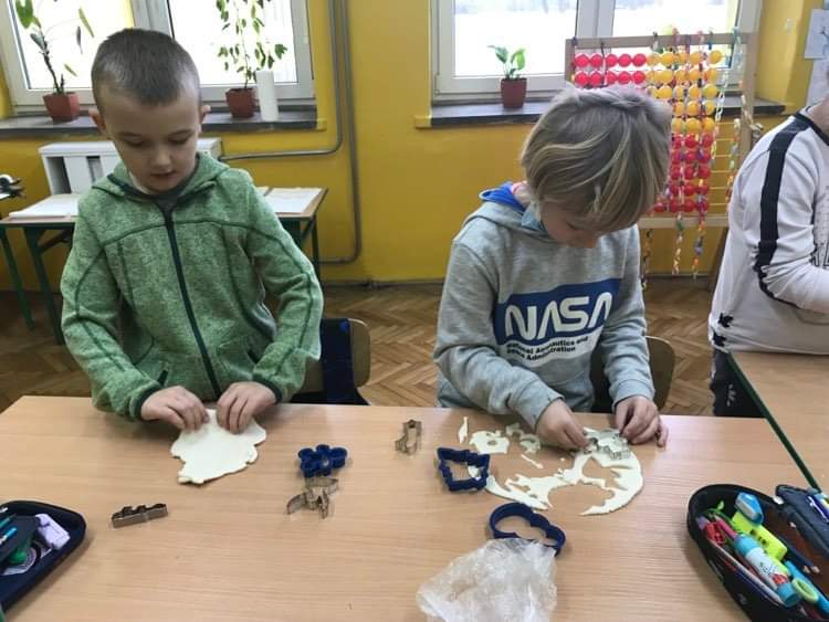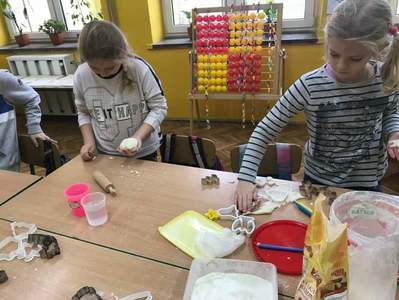 Klasa pierwsza przygotowuje różne ozdoby choinkowe. Wszyscy uczniowie pracują z wielkim zaangażowaniem wykazując się kreatywnością. Masa solna nadaje się do tego znakomicie.T