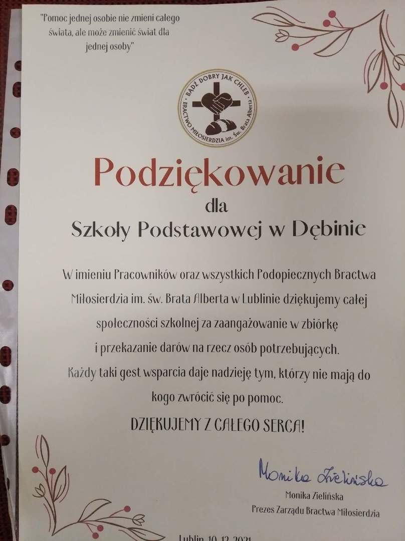 17 grudnia 2021 r. zakończyła się w naszej szkole zbiórka artykułów spożywczych i chemicznych dla Bractwa Miłosierdzia im. św Brata Alberta w Lublinie. W listopadzie i grudniu zbieraliśmy następujące artykuły żywnościowe : makaron, ryż, mąka, olej, cukier, konserwy mięsne i rybne, warzywa, przetwory, itp. oraz artykuły chemiczne i higieny osobistej takie jak: mydło, płyn do mycia naczyń, szampony, ręczniki papierowe, maszynki do golenia oraz środki do dezynfekcji.