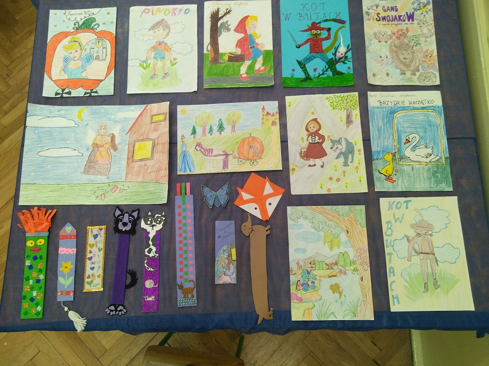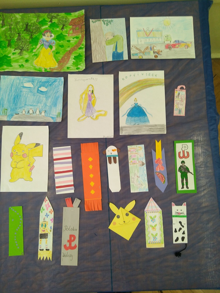 4. Zorganizowano dwa konkursy: plastyczny pt. „Mój ulubiony bohater z baśni lub bajki” i konkurs na „Najpiękniejszą zakładkę do książki”.