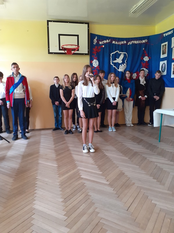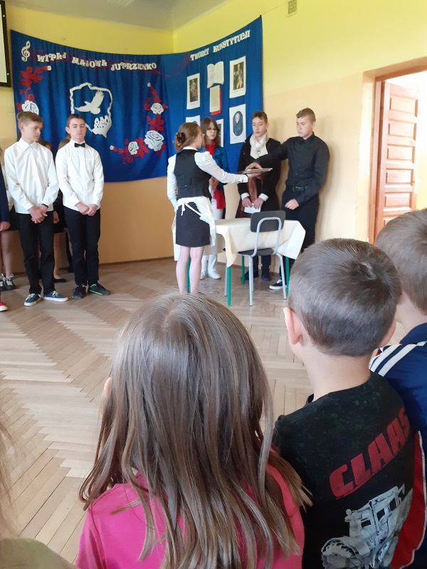 Aby podkreślić rangę prezentowanych wydarzeń, uczniowie recytowali patriotyczne wiersze znanych polskich twórców oraz śpiewali takie utwory muzyczne jak.: „Witaj majowa jutrzenko...”, „Polonez 3 Maja”.