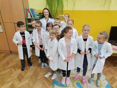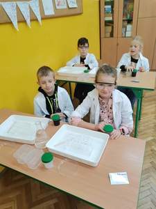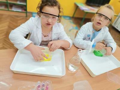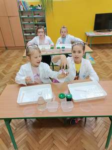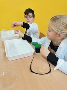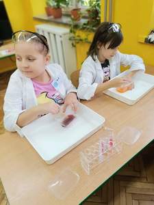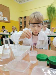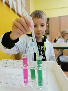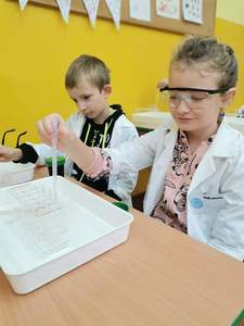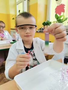 Młodzi Chemicy sprawili, że ciemnoniebieska substancja zmieniła barwę na optymistycznie różową i wiosennie zieloną w zależności od odczynu roztworu w probówce. Zbadali zatem wpływ pH badanych roztworów na kolor wskaźnika chemicznego jakim był wywar z liści czerwonej kapusty. Następnie stworzyli od podstaw antystresowego slime’a - gniotka, który rozciągał się aż do postaci cieniutkiej błony. Dzieci ozdobiły go barwnymi kuleczkami oraz dosypały ulubionego barwnika. Pani prowadząca warsztaty była zachwycona prawidłowością wykonywanych przez uczniów eksperymentów, ich uwagą i zaangażowaniem, pod koniec zajęć każdemu wręczyła zasłużone dyplomy. Z takimi upominkami oraz z pozytywnymi wspomnieniami uczniowie wrócili do domów.