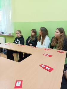 Druga część spotkania poświęcona była obyczajom i zasadom obowiązującym przy stole dawniej i dziś. Lekcja savoir – vivre'u, przeprowadzona przez Panią Urszulę, na pewno zostanie na długo w pamięci szósto- i siódmoklasistów.