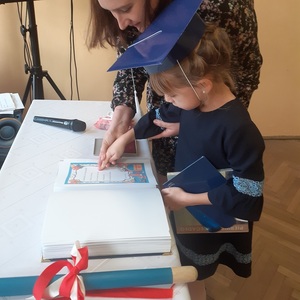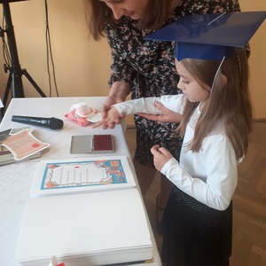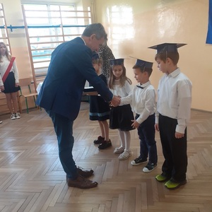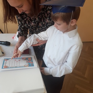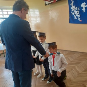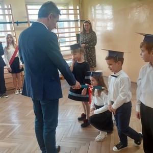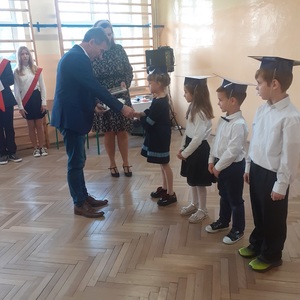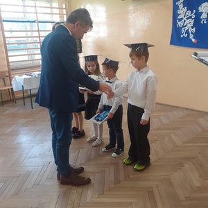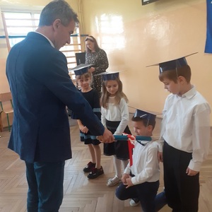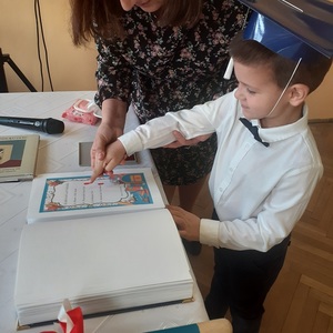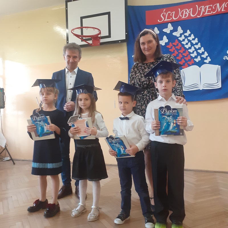 Następnie zostali pasowani przez Pana Dyrektora na uczniów, otrzymali pamiątkowe dyplomy, książki oraz rożki obfitości.