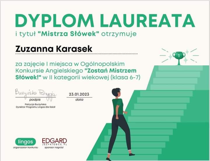 Uczennica naszej szkoły Zuzanna Karasek z klasy 6 została laureatką w swojej kategorii zajmując pierwsze miejsce w Polsce.