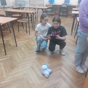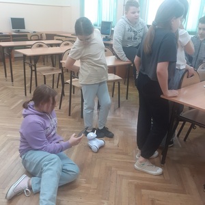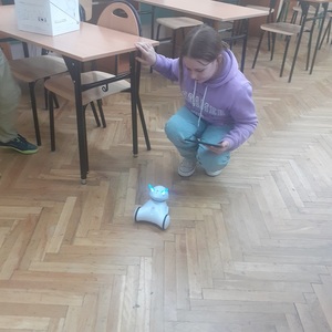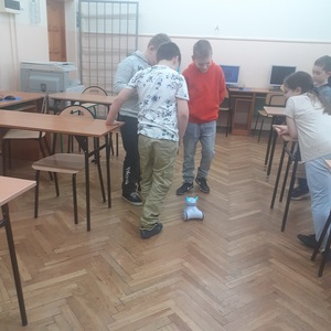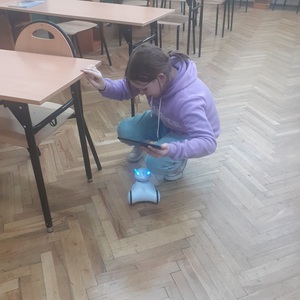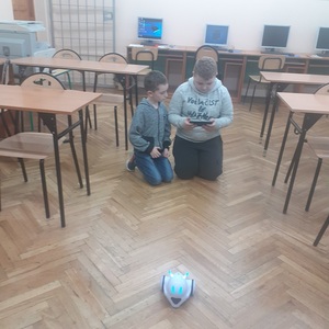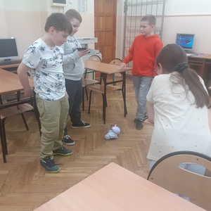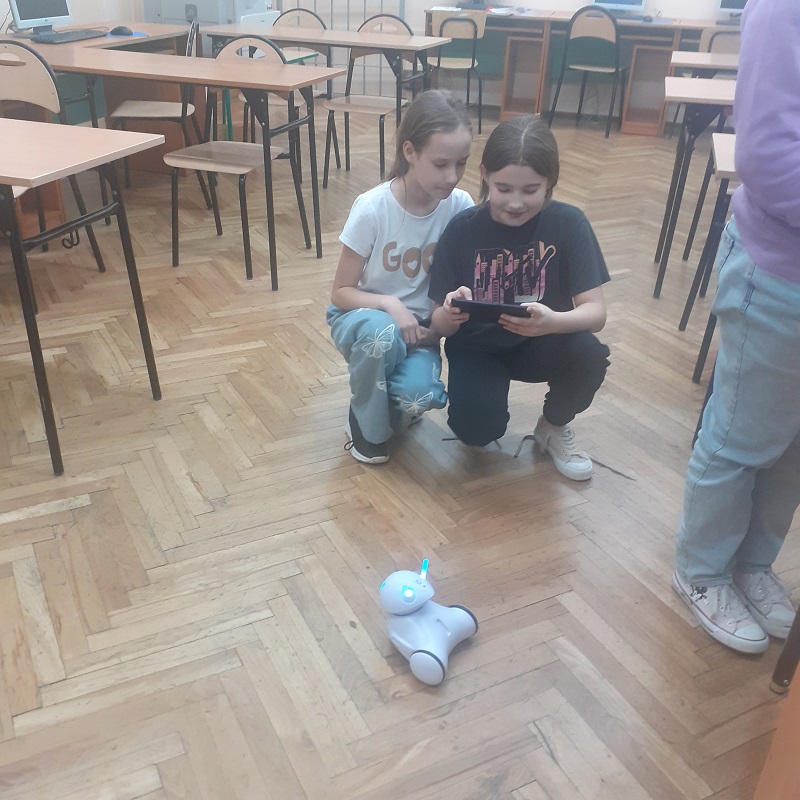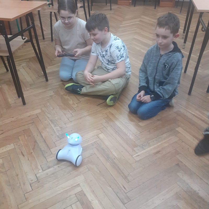 Uczniowie klasy IV na lekcji informatyki uczyli się programowania sterując zdalnie ruchem robota edukacyjnego pozyskanego w ramach projektu Laboratoria Przyszłości.