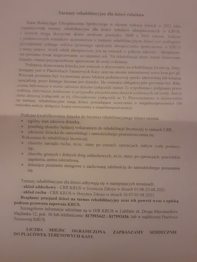 Placówka terenowa Kasy Rolniczego Ubezpieczenia Społecznego w Bychawie informuje, że w 2023 roku istnieje możliwość wyjazdu dzieci rolników na turnusy rehabilitacyjne w okresie wakacji.