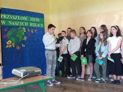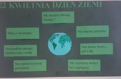 24 kwietnia odbyła się akademia z okazji Dnia Ziemi, którą przygotowali uczniowie klasy V.   Treści przekazane przez uczniów uświadomiły nam konieczność dbania o środowisko naturalne oraz to, że każdy z nas ma wpływ na jego stan. Dowiedzieliśmy się o: