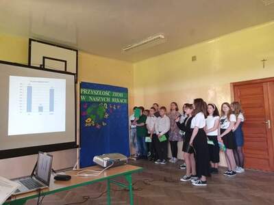 Uczniowie przedstawili również prezentację, w której zapoznali nas z  wynikami ankiety, jaką przeprowadzili wśród uczniów klas IV-VIII. Ankieta  dotyczyła działań ekologicznych, jakie każdy z nas prowadzi w życiu codziennym.
