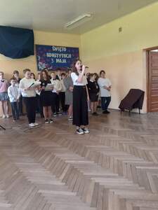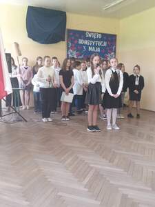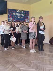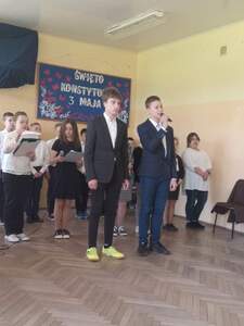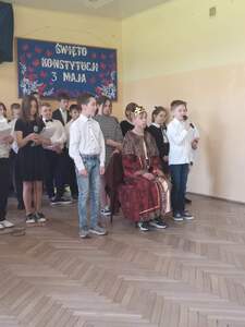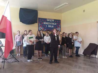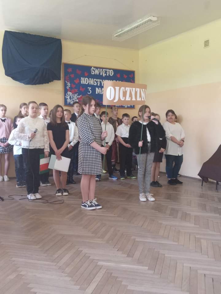 Uczniowie recytując piękne wiersze, przy akompaniamencie pieśni patriotycznych przybliżyli społeczności Naszej Szkoły historię Konstytucji 3 Maja, będącej pierwszą w Europie, a drugą na świecie.