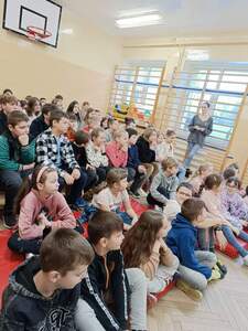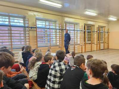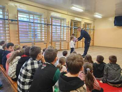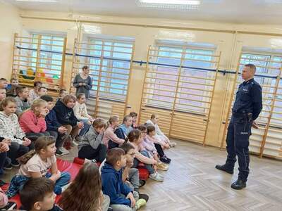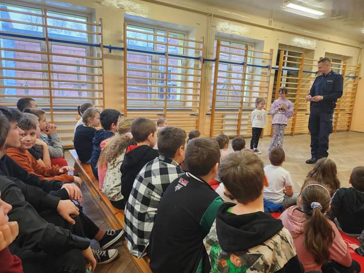 Dzielnicowy przedstawił uczniom podstawowe zasady bezpieczeństwa, obowiązujące podczas zabaw i sportów zimowych na świeżym powietrzu, a także zasady bezpiecznego korzystania z internetu.
