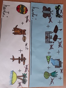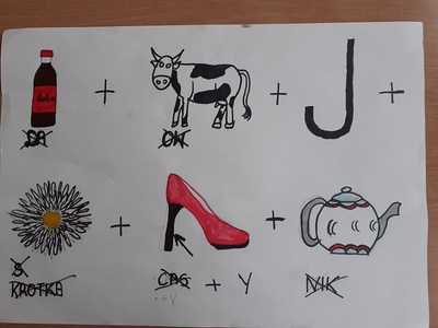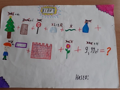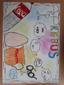 Uczniowie klasy czwartej wykonali rebusy ilustrujące popularne w języku polskim związki frazeologiczne.