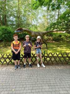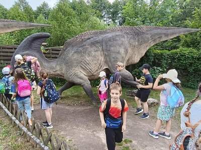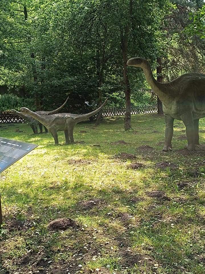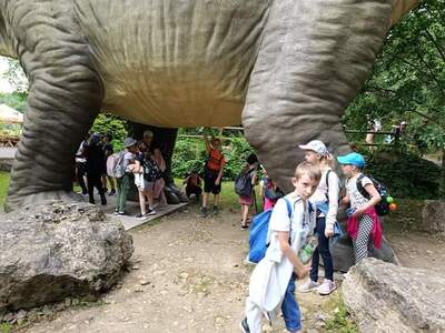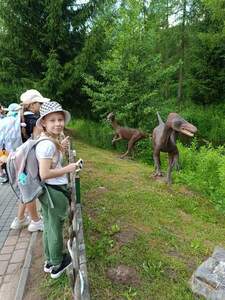 Najpierw odbyliśmy spacer po parku dinozaurów JuraPark. Trasa podzielona jest na okresy geologiczne, dlatego mogliśmy przyjrzeć się procesom rozwoju zwierząt na planecie. Modele zwierząt mają faktyczne rozmiary poszczególnych gatunków dinozaurów, co pozwoliło nam zrozumieć, jak różne i czasami niesamowicie wielkie były to stworzenia. Tu, gdzie obecnie leży park, była jurajska plaża, po której wędrowały dinozaury, czego dowodem są odnalezione w bałtowskim wąwozie tropy tych zwierząt.