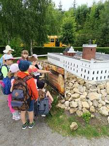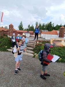 Następnie zostaliśmy podzieleni przez przewodnika na 3 grupy i wzięliśmy udział w grze terenowej w parku miniatur „Polska w miniaturze”. Park ten o pow. ok 1 ha jest uformowany na kształt naszej Ojczyzny z zaznaczonymi głównymi rzekami, jeziorami i krainami geograficznymi. Na terytorium parku znajduje się 50 miniatur zamków i pałaców stanowiących najciekawsze zabytki architektoniczne powstałe na przestrzeni ostatnich 500 lat. To była niesamowita lekcja historii!