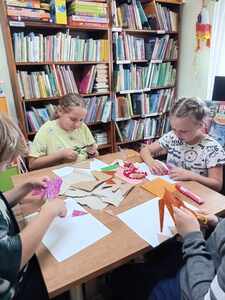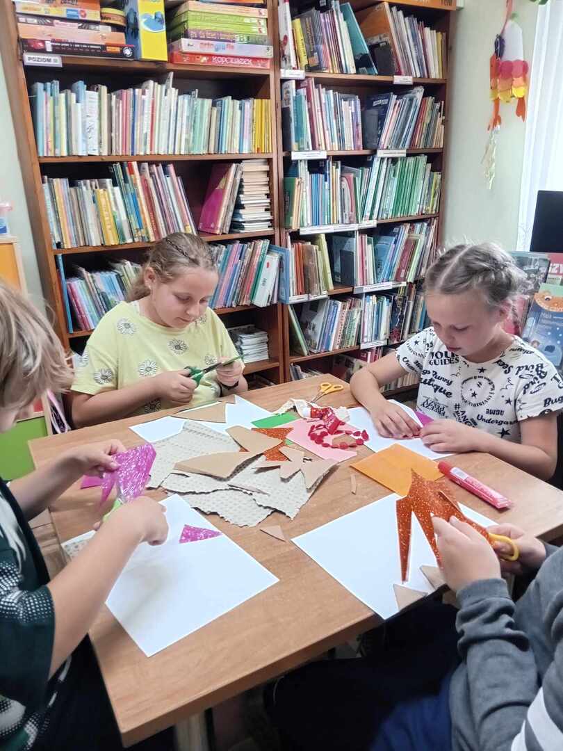 Dzieci aktywnie uczestniczyły w zajęciach, chętnie wypowiadały się na tematy zwiążane z ilustracją i wyrażały swoje emocje w sposób plastyczny. Kulminacyjnym punktem warsztatów było wykonanie ilustracji do wiersza Danuty Wawilow "Trójkątna bajka" techniką kolografii. Zajęcia prowadziła biblitekarka Urszula Tkaczyk.