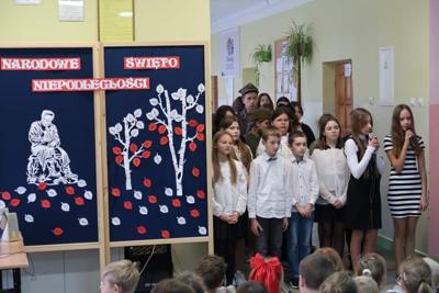 11 listopada przedstawiciele Samorządu Uczniowskiego naszej szkoły uczestniczyli w gminnych obchodach  Narodowego Święta Niepodległości, które odbyły się w Zakrzewie. Najpierw wzięli udział we Mszy św. w intencji Ojczyzny odprawionej w kościele pod wezwaniem św. Józefa, następnie złożyli wraz z innymi delegacjami wieńce przed pomnikiem upamiętniającym pomordowanych, poległych i walczących o Niepodległą Polskę. Zespół śpiewaczy „Dębinki”, do którego należy wielu uczniów naszej szkoły, zaprezentował w sali konferencyjnej UG w Zakrzewie koncert pieśni i piosenek patriotycznych.