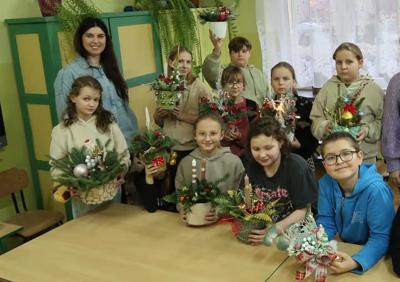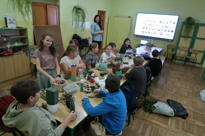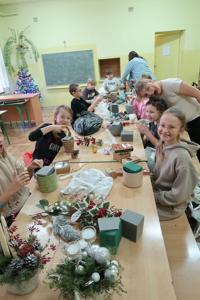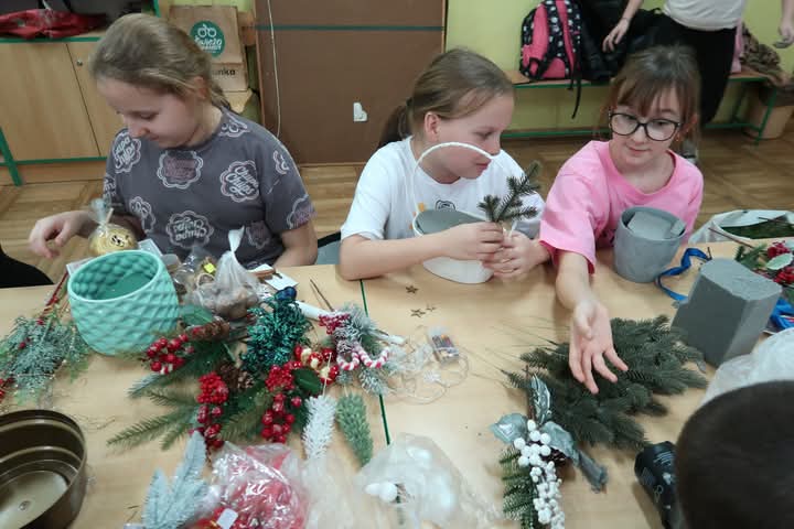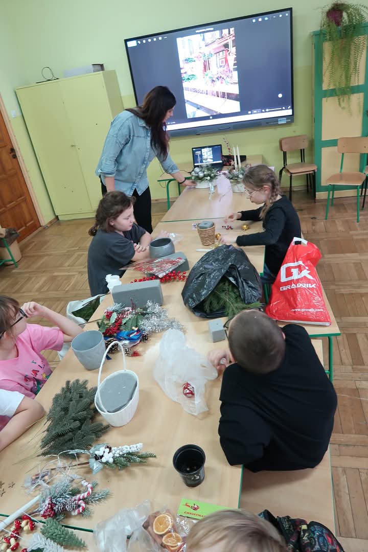 W ramach projektu "Wiedza kluczem do przyszłości - wsparcie dla szkół w Gminie Zakrzew" zorganizowano warsztaty z doradzta zawodowego. Dzięki uprzejmości Pani Ewy Lipiec  absolwentki naszej szkoły, w dniu 12 grudnia 2024 r. uczniowie klasy IV i V wzięli udział w warsztatach florystycznych. Spotkanie miało na celu przybliżenie dzieciom pracy florysty. Uczniowie obejrzeli z wykorzystaniem monitora zakupionego w ramach projektu "Wiedza kluczem do przyszłości - wsparcie dla szkół w Gminie Zakrzew"  prezentację przedstawiającą wykonane przez Panią Ewę kompozycje kwiatowe, bukiety, flowerboxy, lasy w szkle, bukiety z cukierków. Uczniowie pod okiem eksperta wykonali bożonarodzeniowe stroiki. To było bardzo miłe spotkanie.