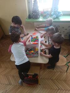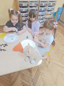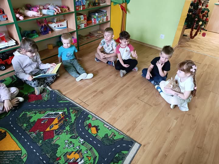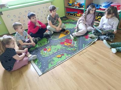 Bardzo ważnym elementem w rozwoju małego dziecka jest kontakt z książką. Niezmiernie ważnym zadaniem przedszkola jest kształtowanie zainteresowania czytelnictwem, zapewnienie dostępu do książek, tworzenie "kącików książki". Przedszkolaki poza codziennym słuchaniem książek czytanych przez nauczyciela oraz wizytami w bibliotece cyklicznie biorą udział w "zajęciach zorganizowanych" przez rodziców i starszych kolegów Ostatnio takie zajecia zorganizowali koledzy z klasy III. Uczniowie przeczytali im fragmenty książki o przygodach sióstr Bingo i Bluey- uroczych pieskach, które są bohaterami bajki pt. "Bluey", następnie wspólnie bawili się w "kąciku zabaw" oraz z pomocą starszych kolegów wykonali pracę plastyczną.