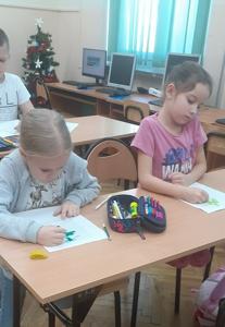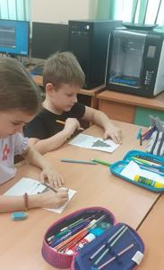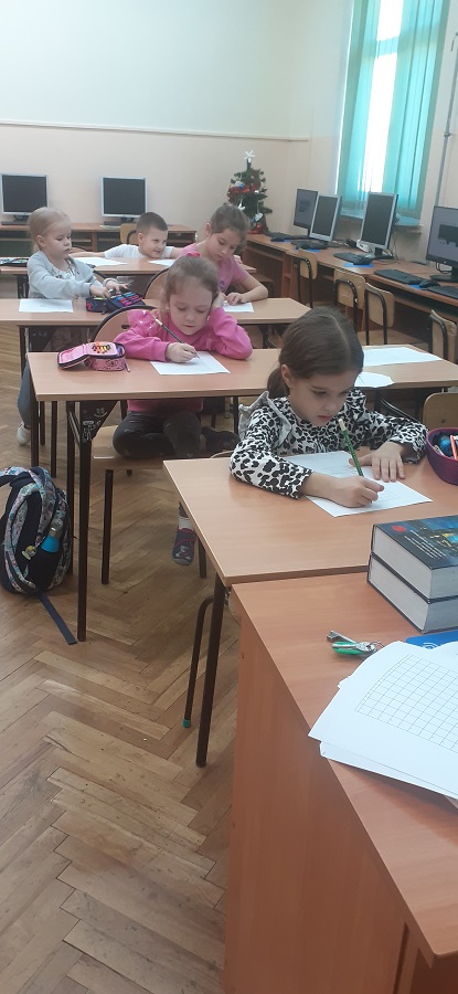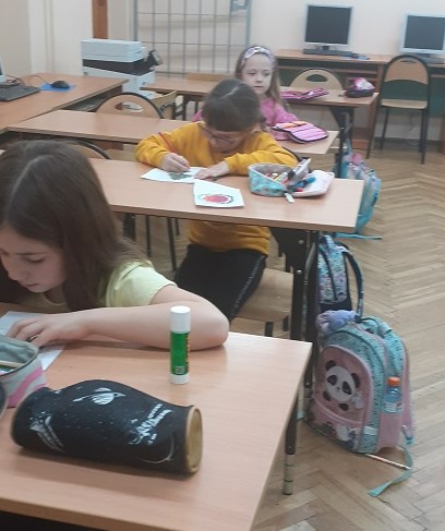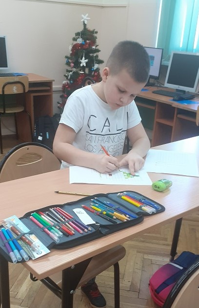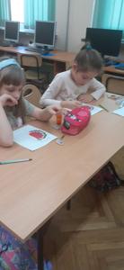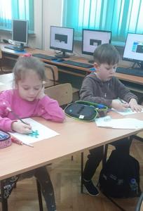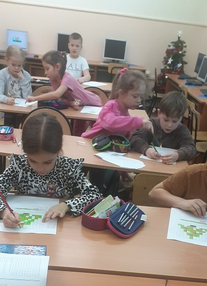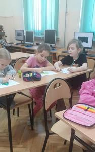 Grupa uczniów klasy I i II na zajęciach z programowania/kodowania bezbłędnie koduje i dekoduje zaszyfrowane kolorowe obrazki.