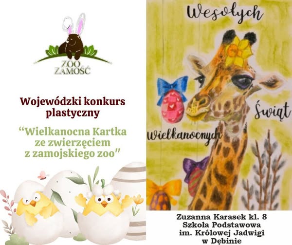 Uczennica klasy 8 - Zuzanna Karasek znalazła się w gronie laureatów wojewódzkiego konkursu plastycznego "Wielkanocna kartka ze zwierzęciem z zamojskiego zoo" zorganizowanym przez Ogród Zoologiczny im. Stefana Milera w Zamościu. Jej praca zdobyła drugie miejsce w kategorii uczniów klas VII-VIII.
