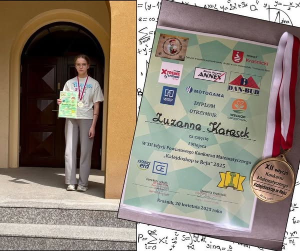Zuzanna Karasek matematyczną mistrzynią powiatu. W dniu 28 kwietnia 2025 roku odbył się finał XII edycji konkursu matematycznego „Kalejdoskop w Reju” organizowanego przez II Liceum Ogólnokształcące im. Mikołaja Reja w Kraśniku. Finał zgromadził aż 88 uzdolnionych uczniów z okolicznych szkół podstawowych.