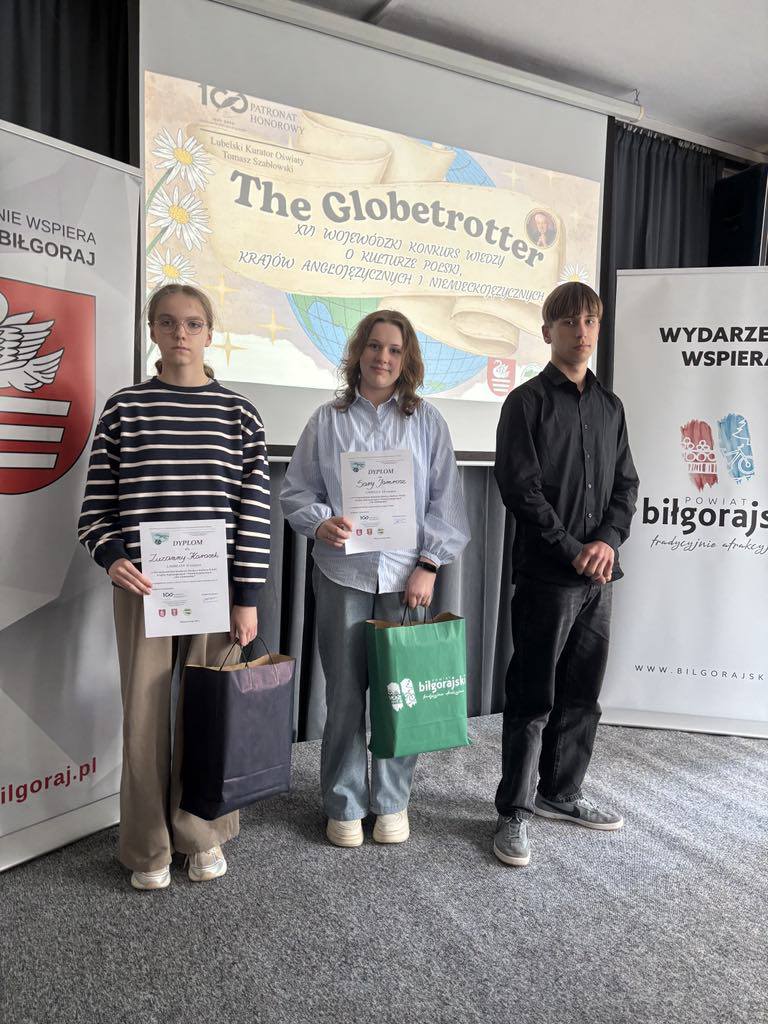 Z radością informujemy o sukcesach naszych uczniów w XVI Wojewódzkim Konkursie Wiedzy o Kulturze Polski, Krajów Anglojęzycznych i Niemieckojęzycznych „The Globetrotter”, którego organizatorem była Szkoła Podstawowa nr 1 im. Błogosławionego Księdza Prymasa Stefana Kardynała Wyszyńskiego w Biłgoraju. Konkurs od lat cieszy się dużym zainteresowaniem i ma na celu m.in. motywowanie młodzieży do nauki języków obcych, poszerzanie wiedzy o kulturze i historii Polski oraz krajów anglo- i niemieckojęzycznych.
