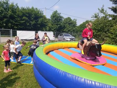 Dla odważnych przygotowano byka rodeo. Walka o to, by jak najdłużej utrzymać się na jego grzbiecie, wywoływała wiele emocji i śmiechu.