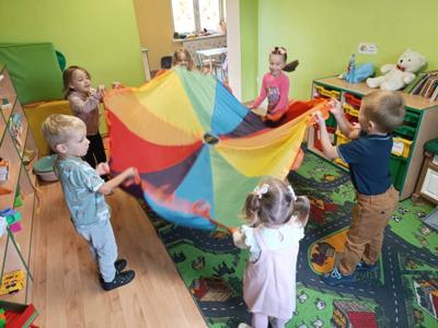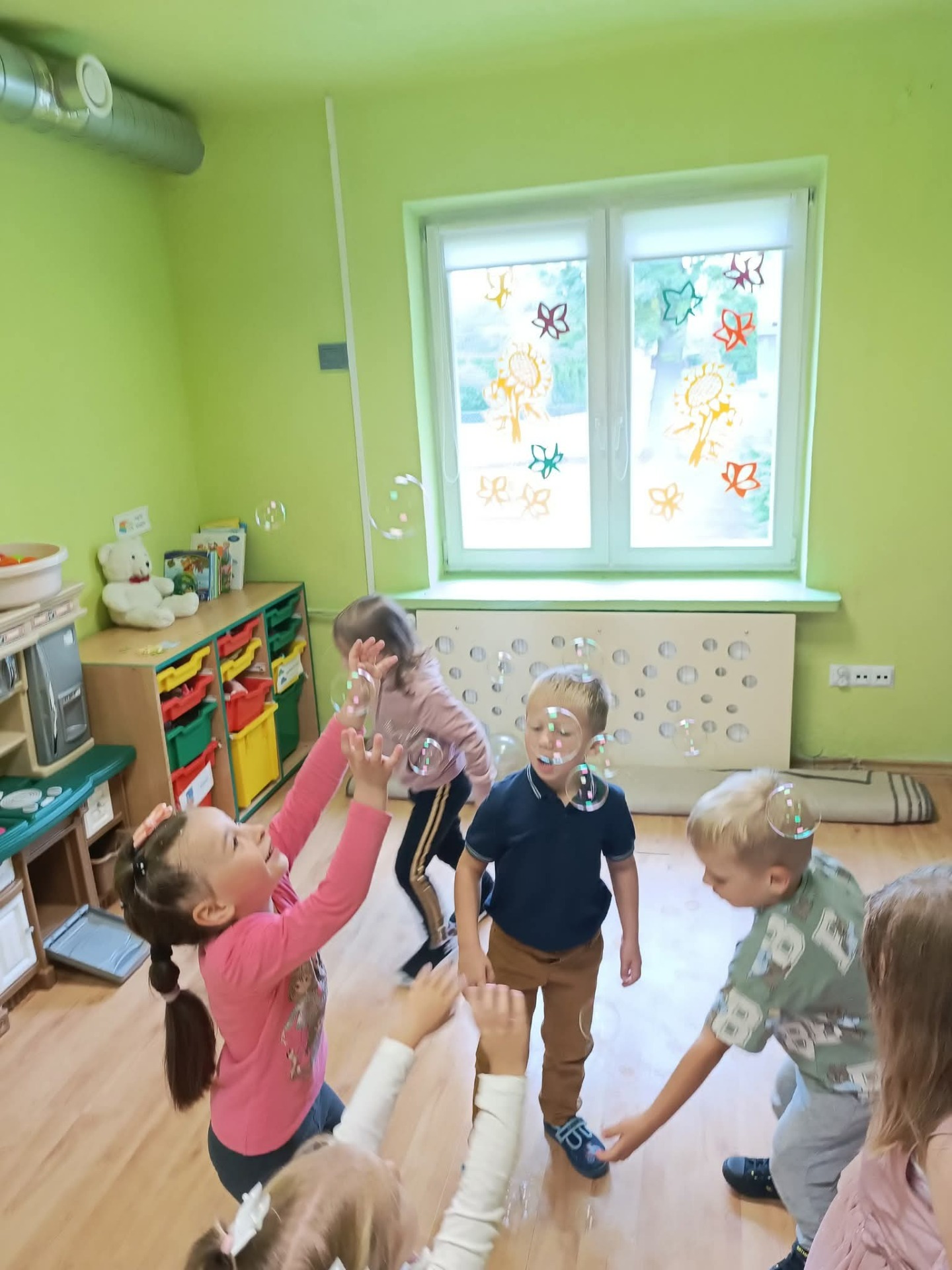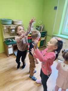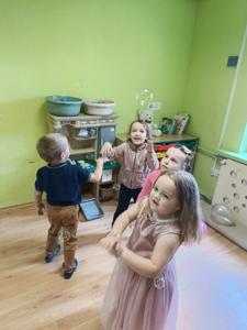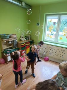 Dzieci wzięły udział w zabawach muzyczno - ruchowych, plastycznych i kreatywnych, które rozwijały ich wyobraźnię i umiejętność współpracy. Nie zabrakło śmiechu, muzyki i oczywiście baniek mydlanych, które wszyscy uwielbiają.