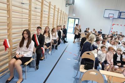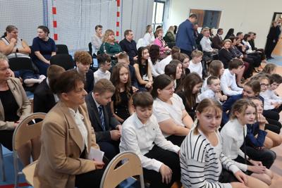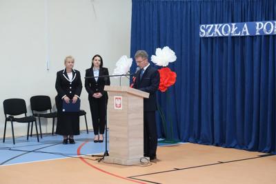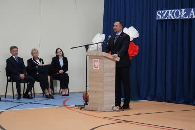 Pan Dyrektor powitał także wszystkich Uczniów, Nauczycieli i Pracowników szkoły oraz Rodziców na czele z Przewodniczącą Rady Rodziców Panią Moniką Wtykło.