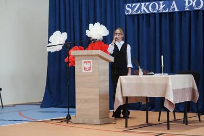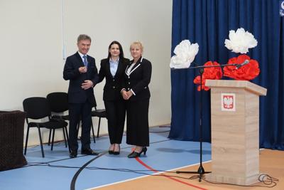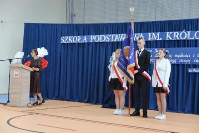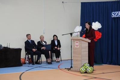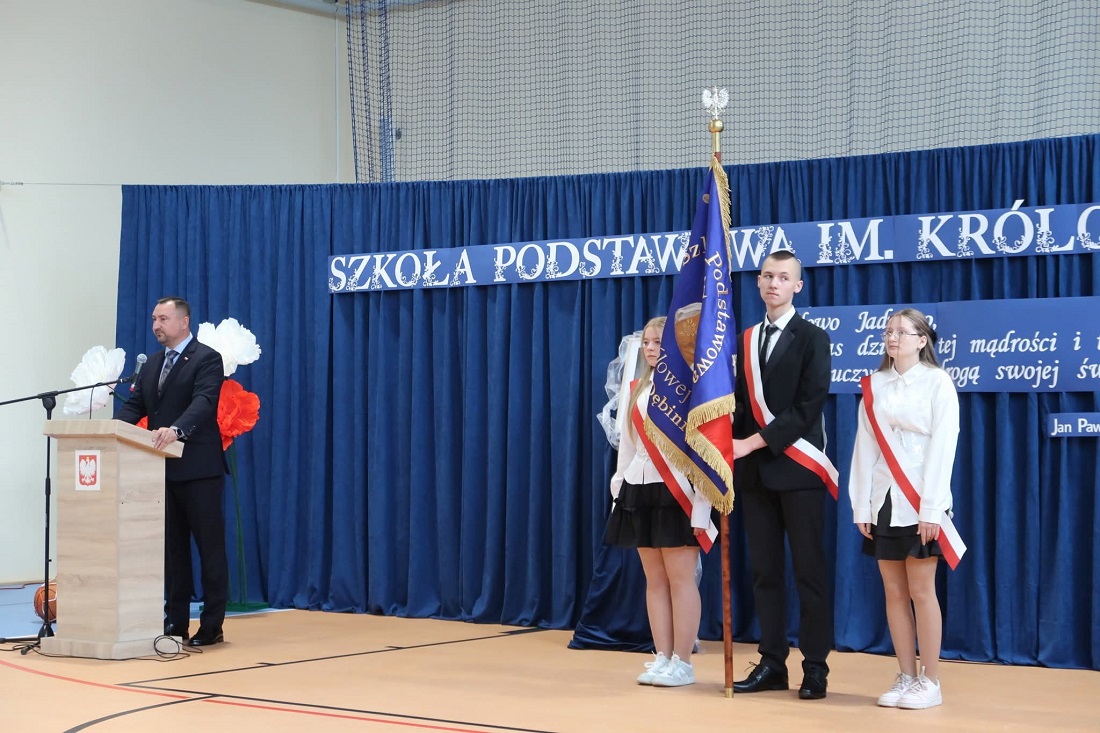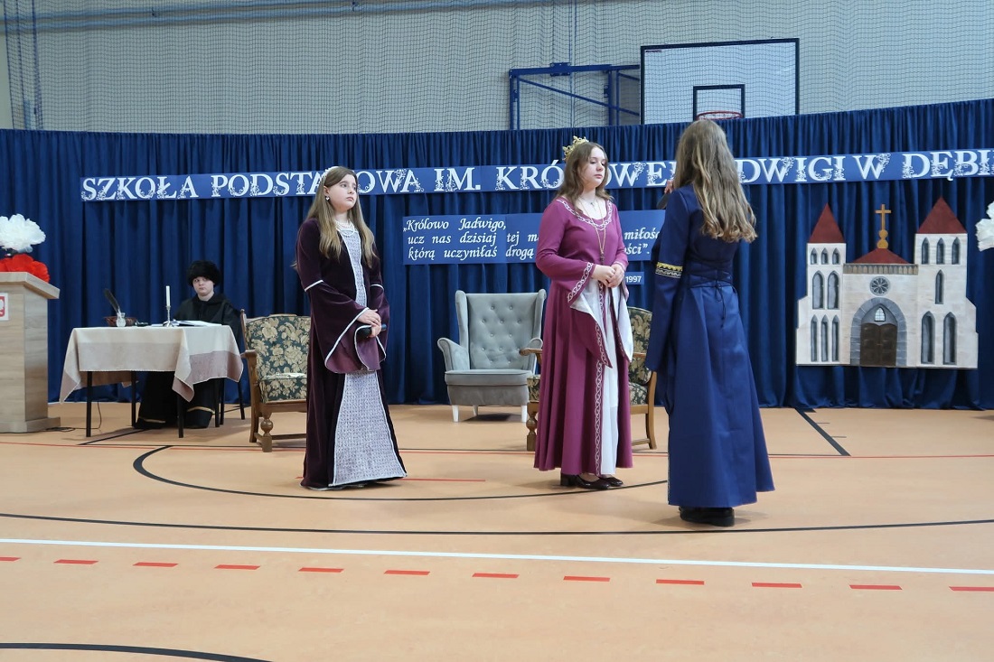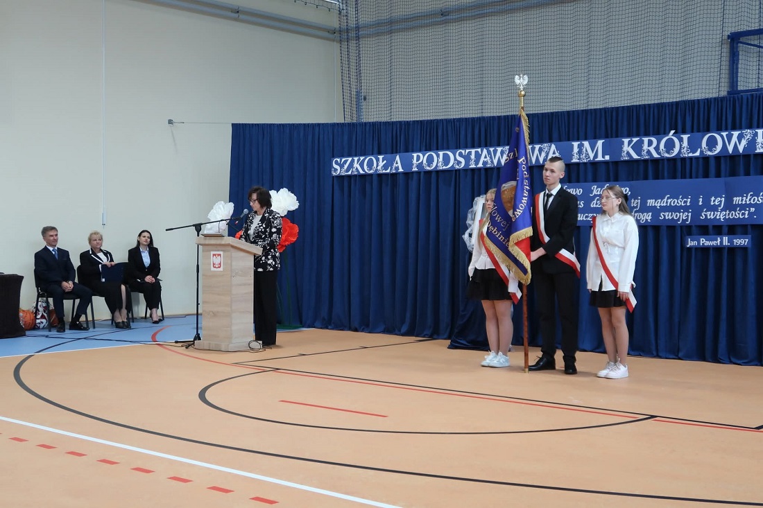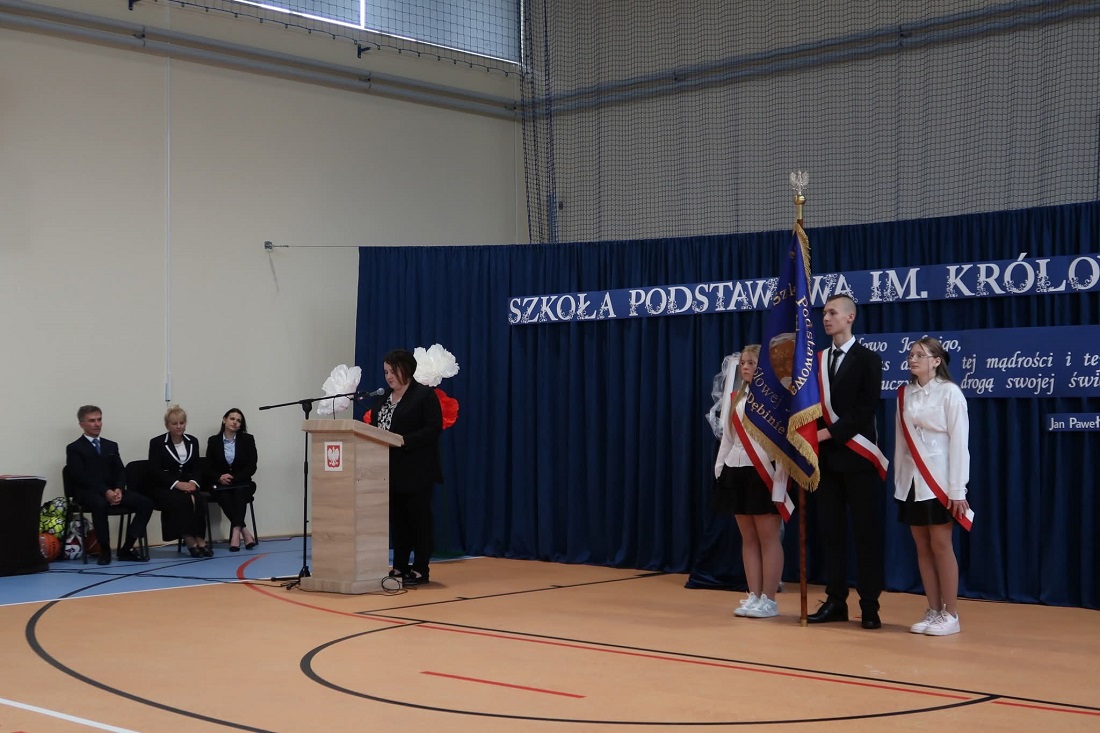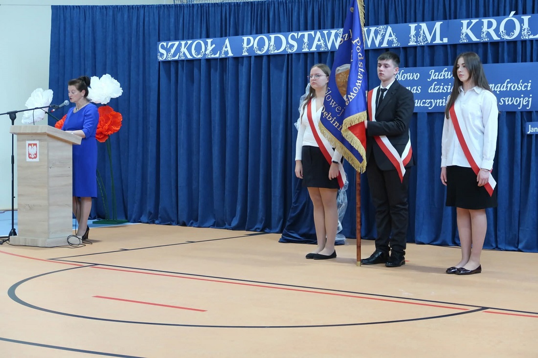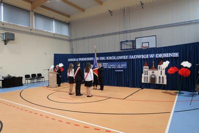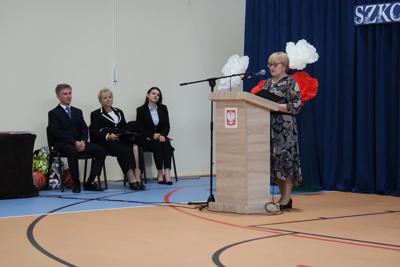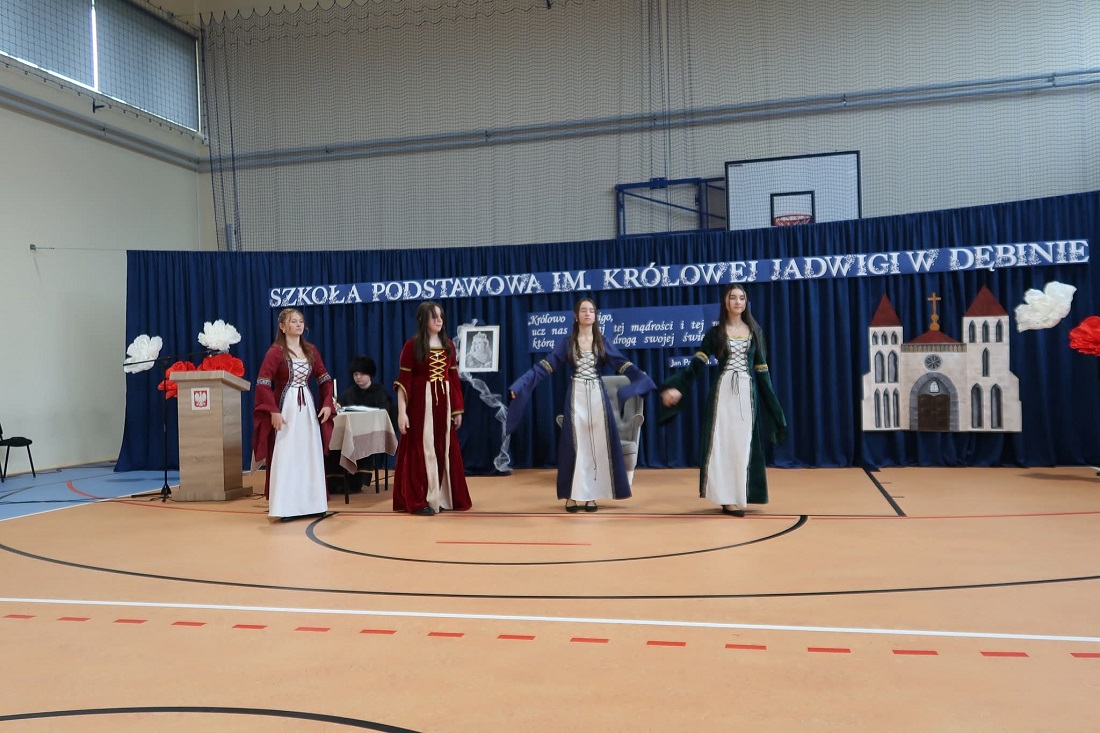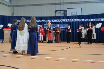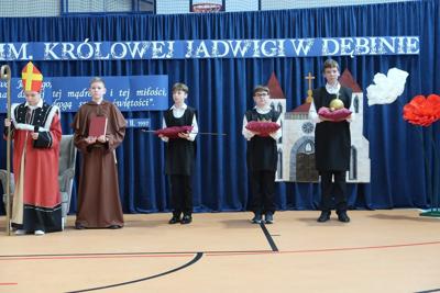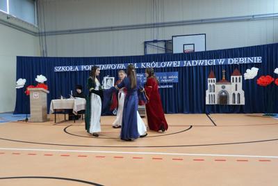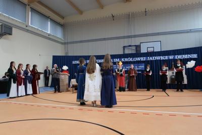 Następnie wysłuchaliśmy okolicznościowego przemówienia Pana Dyrektora, po którym Pani Mariola Skrzypek odczytała Uchwałę Rady Gminy Zakrzew o nadaniu Szkole Podstawowej w Dębinie imienia Królowej Jadwigi.