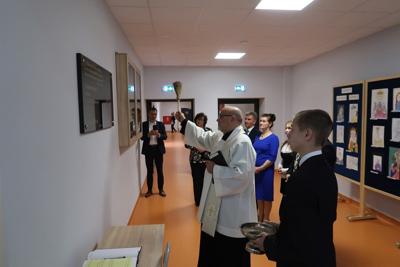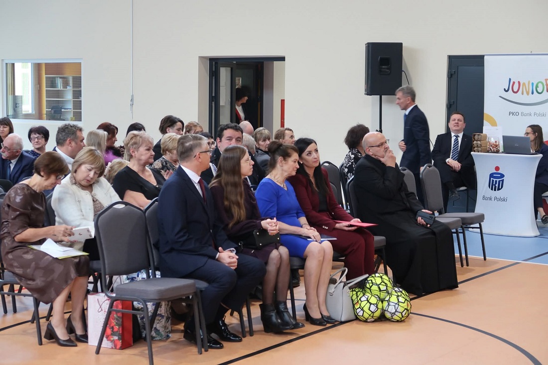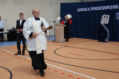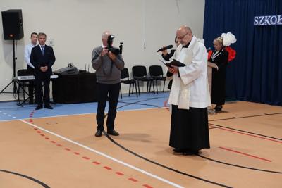 W dalszej części uroczystości - poprzez symboliczne przecięcie wstęgi - dokonano oficjalnego otwarcia sali gimnastycznej. Ksiądz Kanonik Marek Goch odmówił modlitwę błogosławieństwa dla użytkowników nowo otwartej sali. Pan Dyrektor złożył na ręce Pani Wójt Teodory Zaręba podziękowanie władzom Gminy Zakrzew za zrealizowanie tej ważnej dla naszej szkoły inwestycji.