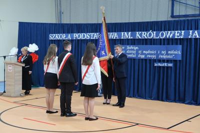 Kolejnym punktem uroczystości była ceremonia przekazania sztandaru szkoły Panu Dyrektorowi przez Rodziców, po czym Pan Dyrektor przekazał sztandar przedstawicielom Uczniów. Następnie Uczniowie, Nauczyciele i Rodzice złożyli uroczyste ślubowanie na sztandar szkoły.