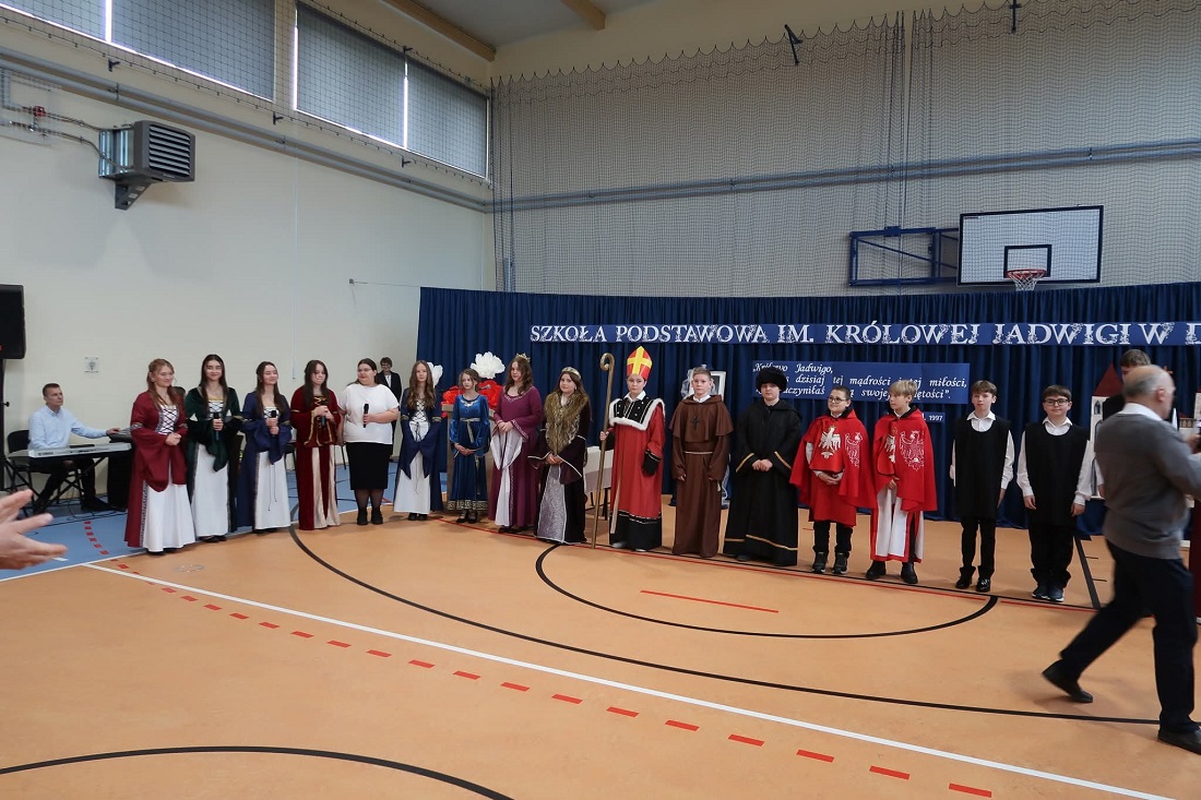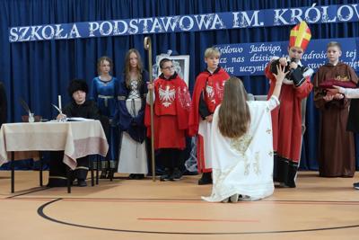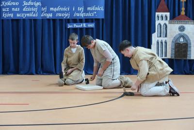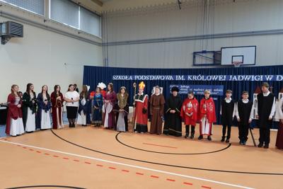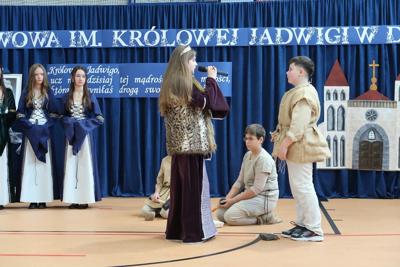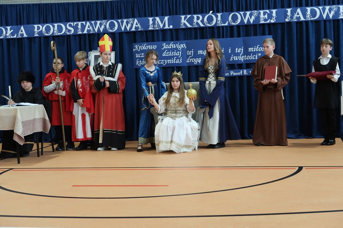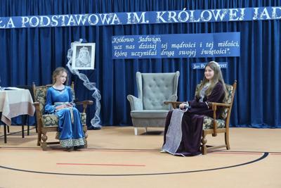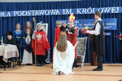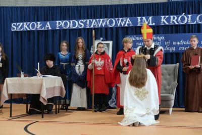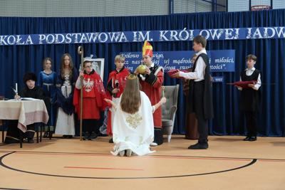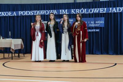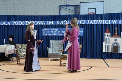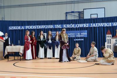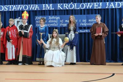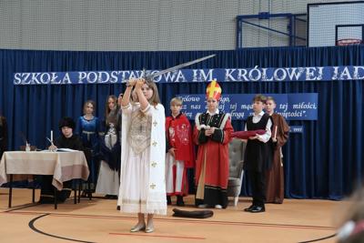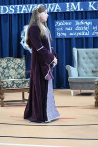 Po części oficjalnej uczniowie klas V- VIII zaprezentowali program artystyczny, który przybliżył zebranym postać naszej wspaniałej Patronki i wartości, którymi kierowała się w życiu. Wzruszenie na twarzach widzów, brawa i pochwały, które po zakończonej uroczystości padały pod adresem naszych szkolnych artystów, świadczą o tym, że inscenizacja dostarczyła Gościom niezapomnianych wrażeń. Dziękujemy Uczniom i Nauczycielom za zaangażowanie w przygotowanie tego programu, a Rodzicom za zorganizowanie strojów, które były dopełnieniem treści prezentowanych podczas części artystycznej.