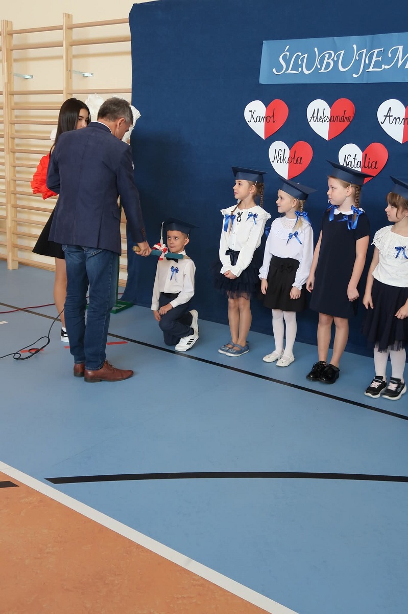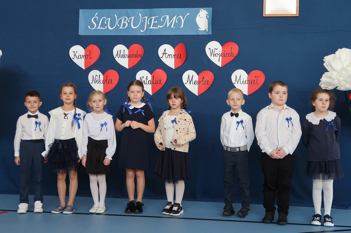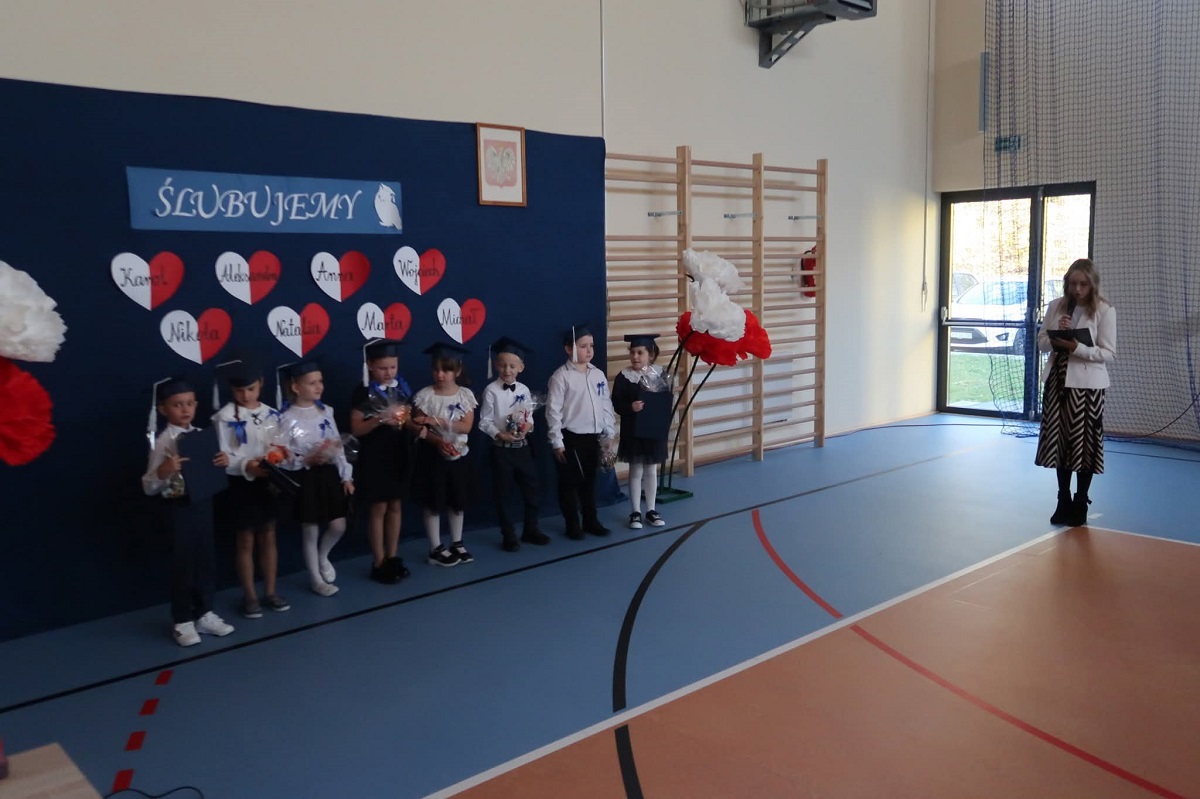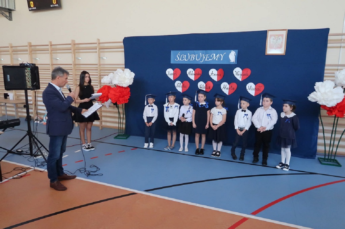 Uroczystość rozpoczęła się od występu artystycznego przygotowanego przez uczniów klasy pierwszej. Dzieci zaprezentowały program słowno–muzyczny, w którym udowodniły, że są gotowe, by stać się prawdziwymi uczniami. Następnie w obecności Dyrekcji szkoły, Nauczycieli, Rodziców oraz zaproszonych Gości uczniowie złożyli uroczyste ślubowanie na sztandar szkoły. Po ślubowaniu Pan Dyrektor- Krzysztof Smerdel dokonała aktu pasowania na ucznia, dotykając ramienia każdego pierwszoklasisty symbolicznym ołówkiem.